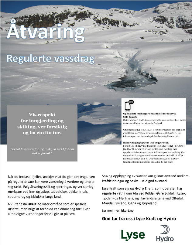 Åtvaring - Regulerte vassdragLyse Kraft og Hydro kjem med venleg oppmoding til deg som ferdast i område som har regulerte vassdrag.