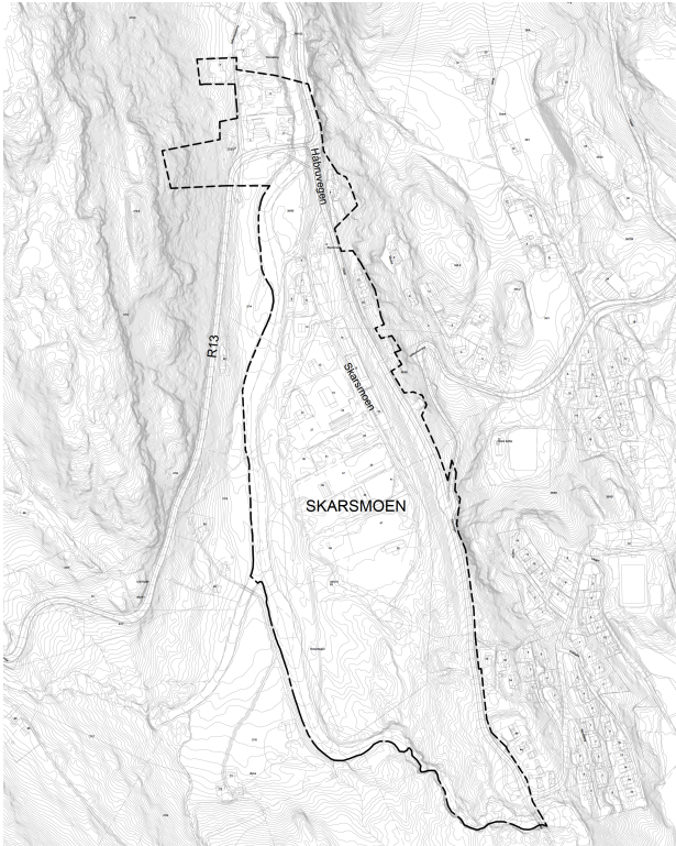 Planområdet er avgrensa som synt på kartet.HRP AS, på vegner av Ullensvang kommune, varsla 01.10.2025 oppstart av detaljreguleringsplan for Skarsmoen etter plan- og bygningslova § 12-8. Etter innspel frå NVE er det gjort nye vurderingar, då planområdet ligg i eit viktig naturområde og omfattar delar av nedbørsfeltet til det verna Opovassdraget. Det er derfor krav om ei omfattande konsekvensutgreiing (KU).